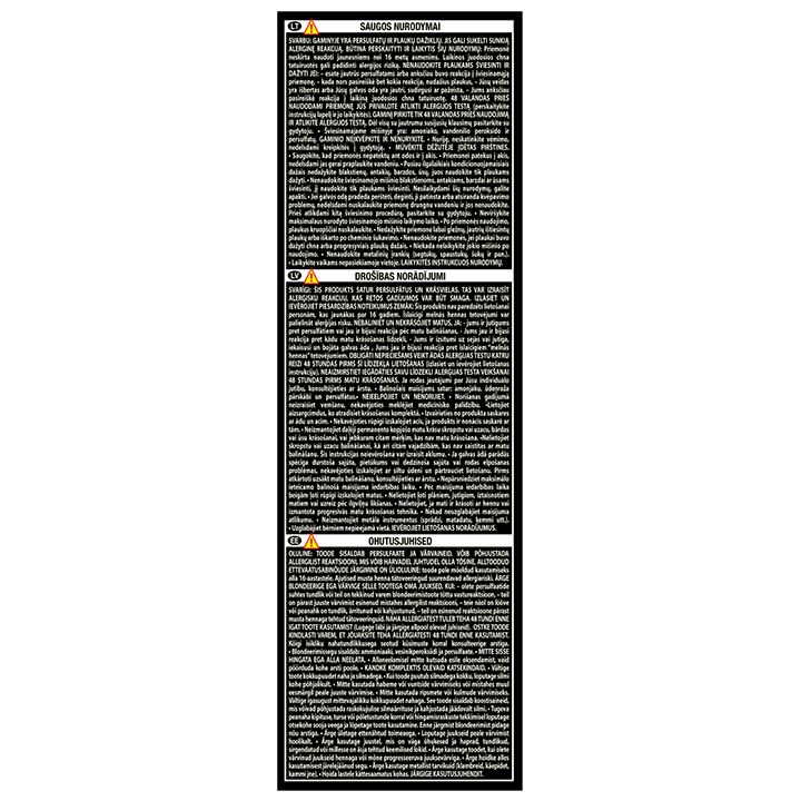OBLIGĀTI NEPIECIEŠAMS VEIKT ĀDAS ALERĢIJAS TESTU KATRU REIZI 48 STUNDAS PIRMS ŠĪ LĪDZEKĻA LIETOŠANAS (izlasiet un ievērojiet lietošanas norādījumus). NEAIZMIRSTIET IEGĀDĀTIES SAVU LĪDZEKLI ALERĢIJAS TESTA VEIKŠANAI 48 STUNDAS PIRMS MATU KRĀSOŠANAS.