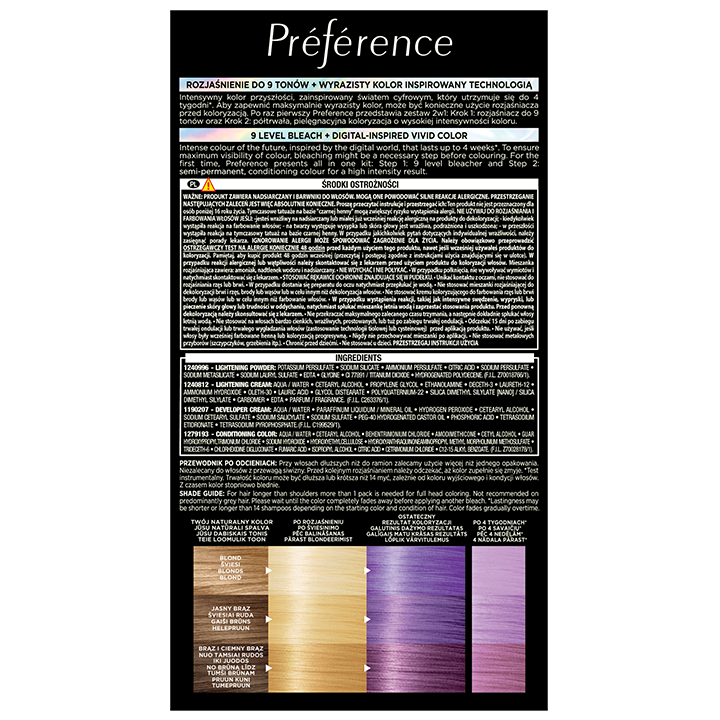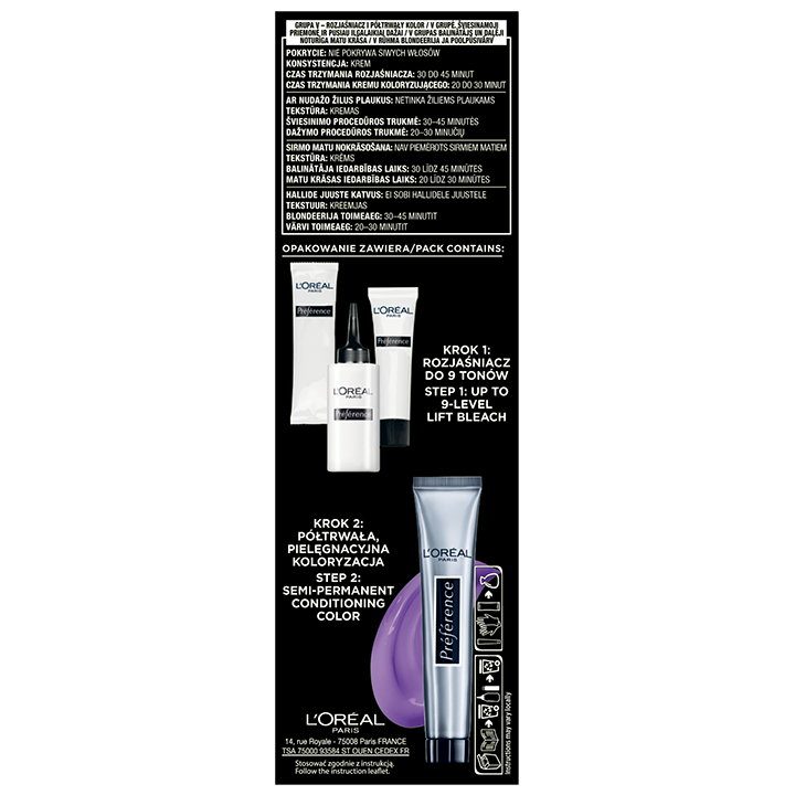 Lai nodrošinātu maksimālu spilgtas krāsas redzamību, balināšana var būt obligāts solis. Pirmo reizi Préférence piedāvā komplektu viss vienā, lai pārvērstu jūsu matu krāsu. Šajā komplektā ir mūsu labākais Préférence balinātājs un daļēji permanenta, kopjoša matu krāsa, lai panāktu intensīvu toni rezultātam.