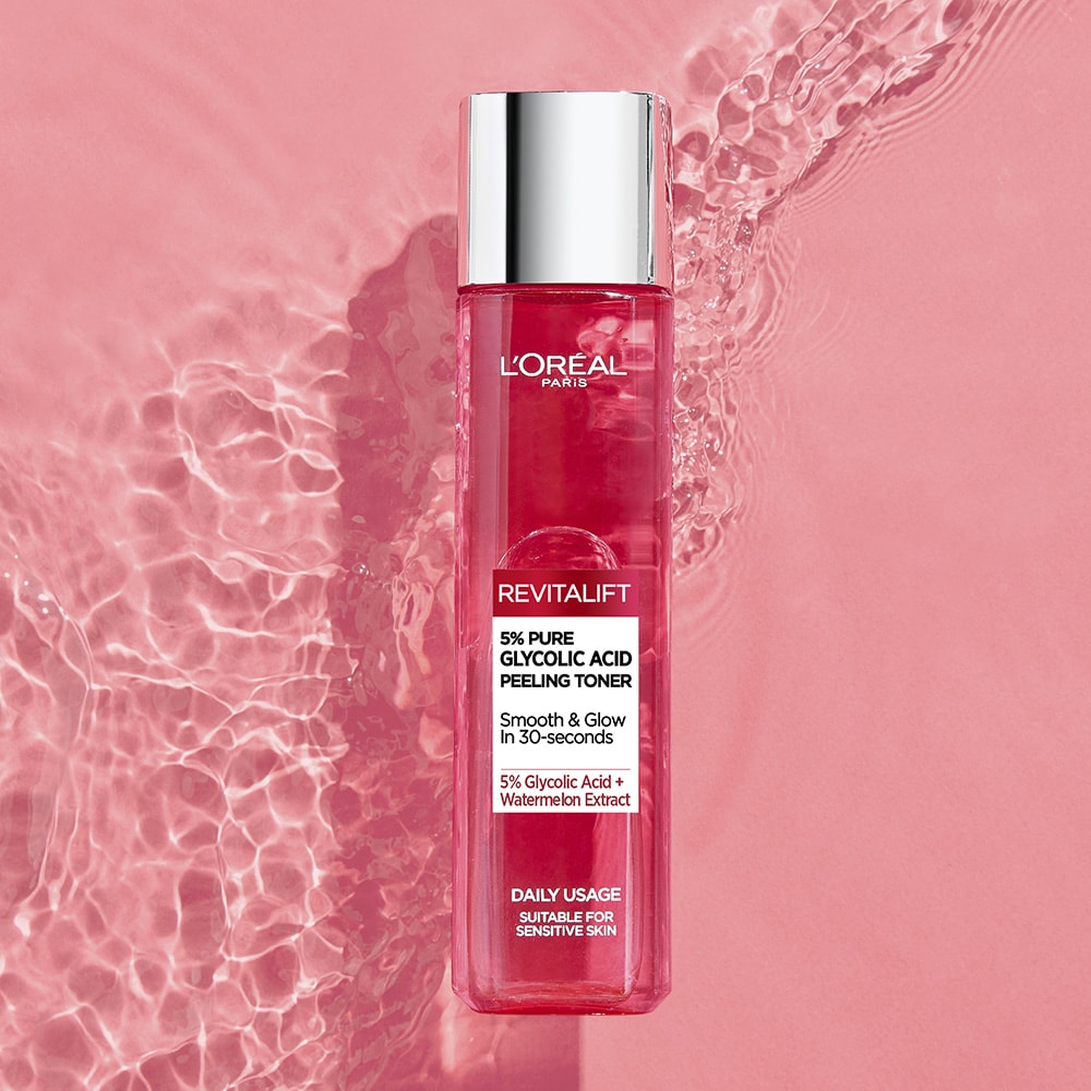L'Oréal Paris Revitalift pīlinga toniks satur ne tikai glikolskābi, bet arī HEPES, lai līdzsvarotu sejas ādu. Turklāt abas sastāvdaļas apvieno savas pīlinga īpašības, ļaujot iegūt gludu ādu 30 sekundēs pēc uzklāšanas.* Arbūza ūdens, alvejas ūdens un pantenols mitrina sejas ādu. Optimālā 5% glikolskābes koncentrācija padara toniku piemērotu pat jutīgai ādai. Produkts atbilst sieviešu vajadzībām, kuras meklē pirmo pretnovecošanās līdzekli, vienlaikus vēloties rūpēties par ādu, kas ir ar nepilnībām un nevienmērīgu tekstūru. Glikolskābe maigi noņem atmirušās ādas šūnas un padara to gludu un mirdzošu. Pēc 30 sekundēm*: ādas kvalitāte ir uzlabojusies. Āda ir redzami gludāka un mirdzošāka. Pēc 4 nedēļām**: ādas struktūra ir ievērojami vienmērīgāka. Ādas nepilnības ir mazāk redzamas. Pēc 8 nedēļām***: ādas tonis ir vienmērīgāks